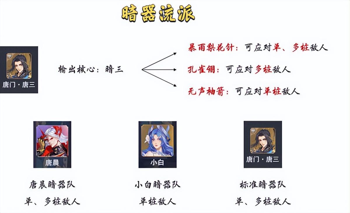 1.现在按照游戏目前的版本,暗器长图打法大概可以分成3类阵容和5个细分玩法。3类阵容分别是唐晨暗器队、小白暗器队和标准暗器队,其中唐晨暗器队和标准暗器队又各可以细分为【暴雨梨花针】的单桩和【孔雀翎】的多桩打法,所以是3类阵容和5个细分玩法。