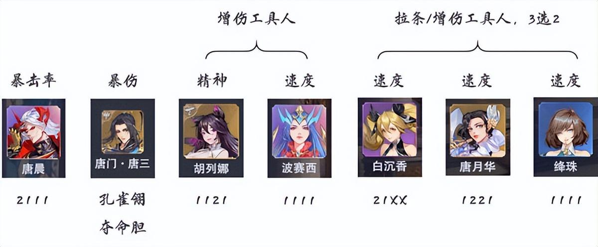 3.白沉香+唐月华+绛珠:这3位魂师在这个阵容的主要作用是拉条,次要作用是增伤,大家可以根据自身的练度和魂师池来进行选择。