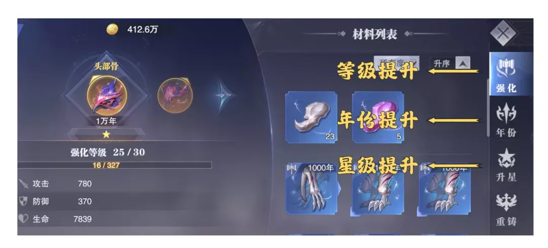 如上图所示,目前游戏中的魂骨培养大致可以分为三大部分:等级提升、年份提升和星级提升,接着我们一个一个来细说: