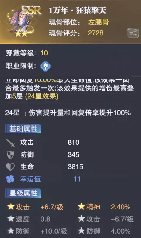 其次在每次提升魂骨年份的同时还会有5%保底的几率提升魂骨的星级,不过也有一些魂骨我们在获得时便会自带一定的幸运值: