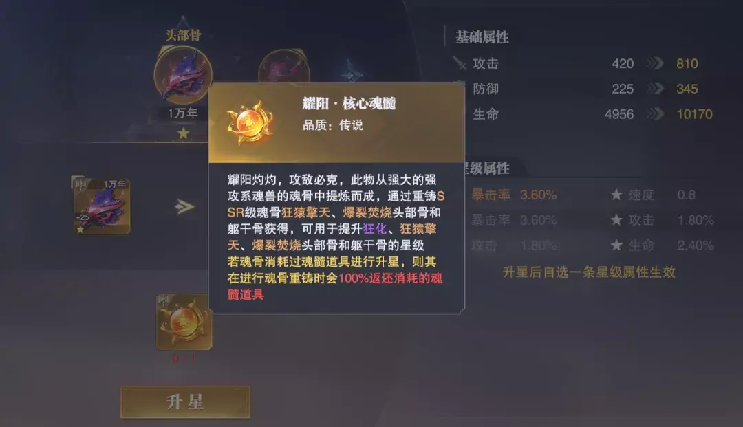 接着第三部分我们来说星级提升的内容,对于星级提升来讲,我们所需的材料则是上图中所示的这个魂髓,不过这里有几点大家需要注意: