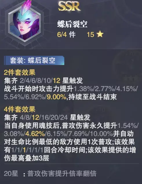 大家可以注意到每一个魂骨套装在累计达到不同的星级时都会有不同的套装效果,我们以“蝶后裂空”魂骨套装为例,2件套的效果是加攻,4件套的效果是使用魂技后的普通追击,而对于选择6件套好还是4+2件套好也是基于这个套装效果来考虑的: