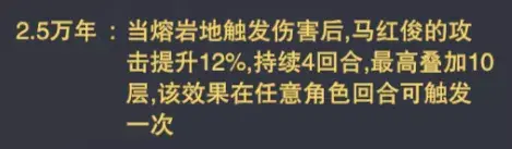 这套阵容的逻辑还是比较简单的:开场以马红俊被动释放的1技能进行点火(施加【灼烧】状态),然后速度排行第一或第二(一般是第一)的火舞利用1技能【火焰流星】对敌方进行眩晕,接着焱利用自身的1技能【地狱岩浆冲】对敌方再次施加全体的【灼烧】状态,然后就是马红俊和柳二龙的打伤害与收割时间,一般来讲马红俊第一回合会使用4技能【凤凰炽焰焚】来制造熔岩地,这个地形不仅可以对敌方造成不俗的伤害,且在造成伤害后还有不低的几率可以让敌方陷入【灼烧】状态,最后每次熔岩地造成的伤害还可以提升马红俊的攻击力,所以大家会注意到熔岩地造成的每次伤害都是在逐渐升高的,待到这个提升攻击效果的层数叠起来后,1次熔岩地的伤害可能就堪比一个小技能,而在2.5万年魂环的支撑下,马红俊理论上可以利用熔岩地提升120%的攻击,这在目前游戏的增伤机制下已经是非常恐怖的存在了。