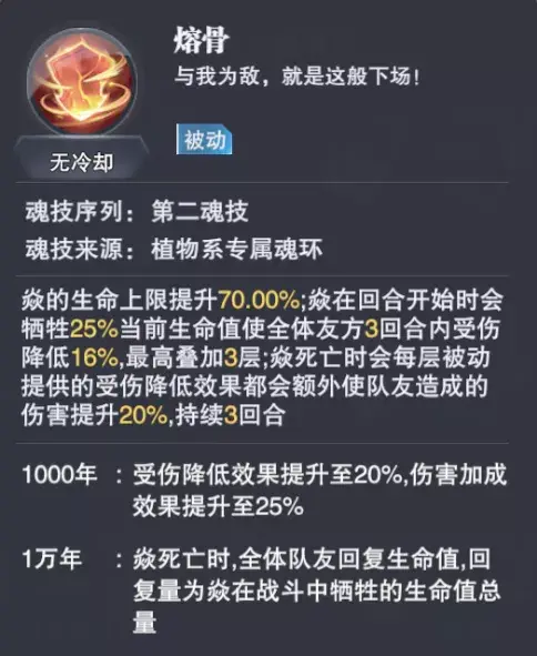 另外焱在这个阵容中主要有3个作用,首先是为队伍提供较为稳定的【灼烧】状态,这在部分玩家携带火舞的蟒蛇系2技能【火棘】的情况下还是比较重要的;第2个作用是为队伍提供一定的减伤能力,这要得益于焱的2技能【熔骨】或【燃魂】;最后第3个作用则是在焱死亡后给队伍提供的限时增伤,这个增伤其实是非常给力的,在3回合内可以理论达到接近甚至超过100%的伤害加成,所以这也是焱给到队伍很好的辅助增强。