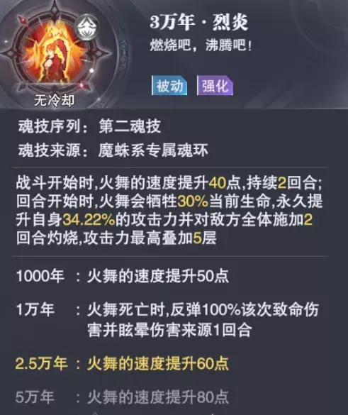 同时部分玩家在火舞拿到魔蛛系魂环后,可以直接利用魔蛛系魂环2技能【烈炎】进行回合前的施加【灼烧】并且利用蟒蛇系魂环1技能【火焰流星】进行眩晕,这样其实胖子在开局时的点火就没有太大的作用了,这也是部分玩家可能会在火队成长到这个阶段放弃胖子的原因(替换成其他的强攻系魂师),不过至于到底是否需要放弃胖子,维一觉得还是更多要看大家的魂师抽取情况来定,反正到现在维一都还是带着胖子的。
