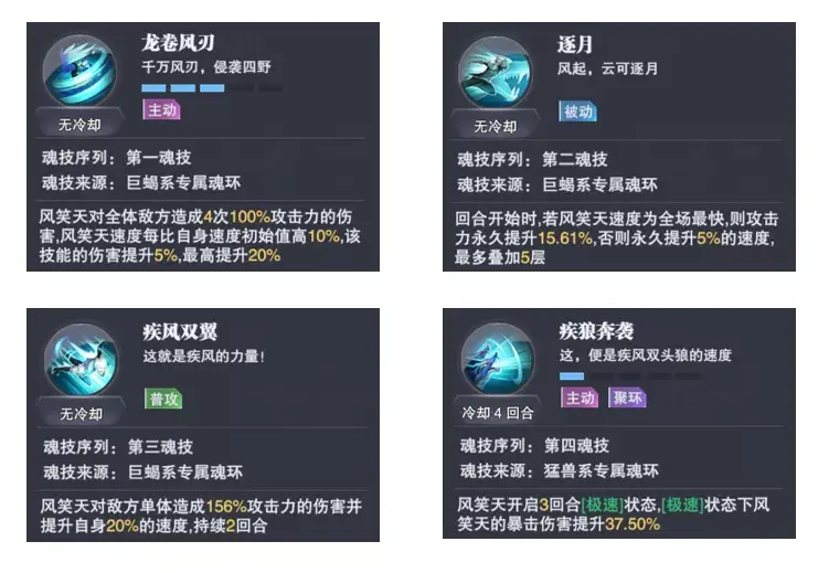 如果大家想用风笑天打伤害的话,技能配置可以选择2221的方式,从第1到第4魂环技能依次选择【龙卷风刃】+【逐月】+【疾风双翼】+【疾狼奔袭】,在开局先行使用4技能【疾狼奔袭】为自己添加聚环效果【极速】,接着就可以在接下来的回合中连续使用1技能【龙卷风刃】了,同时这两个技能在5万年魂环的支持下还会有非常恐怖的联动: