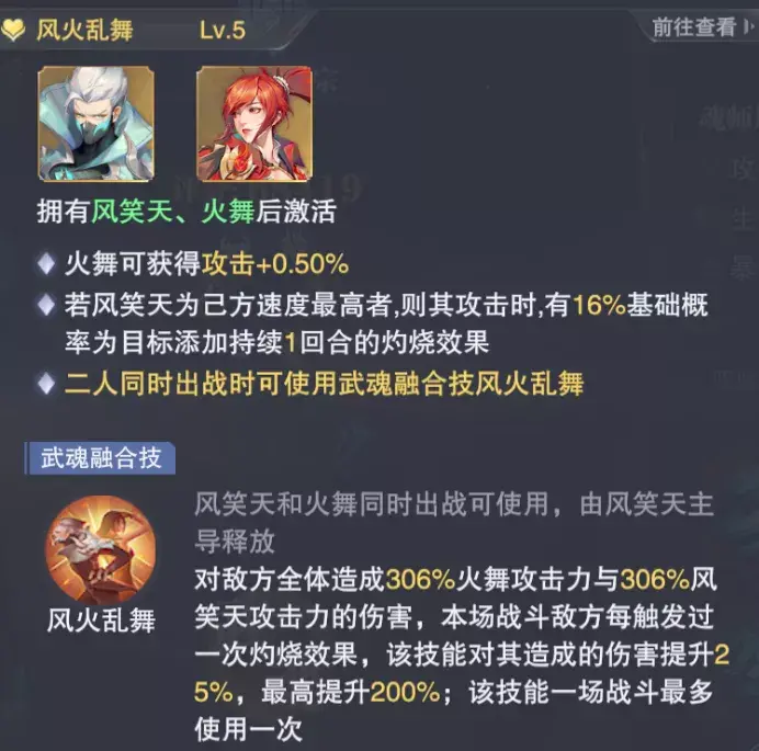 首先风笑天和灼烧队的绝对核心火舞是有一定的技能关联的,除了不怎么使用的武魂融合技【风火乱舞】外,风笑天在攻击敌人时也会有较低的几率对敌人施加【灼烧】效果,当然这并不是我们在这个阵容中使用风笑天的主要原因,而风笑天的核心强度主要在于他的技能搭配机制: