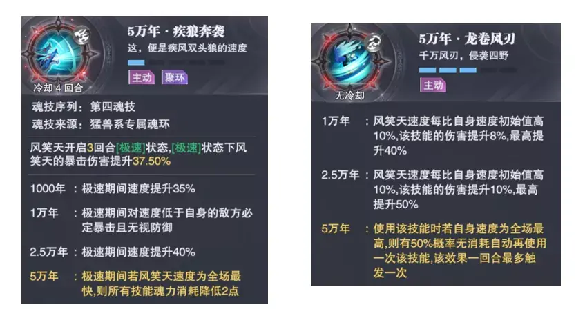 首先【疾风奔袭】5万年魂环的效果是如果风笑天的速度为全场最快,则所有魂技的消耗减少2点,这就意味着【龙卷风刃】的魂力消耗只需要1点;同时【龙卷风刃】在5万年魂环的支撑下还会有全场速度最快时,有50%的几率自动使用此技能一次,外加【疾狼奔袭】1万年魂环给予风笑天的必定暴击且无视防御的效果,这个联动技能输出就是风笑天能在刚刚结束的“锤名昊天”活动中成为一众大佬最优选的最大原因。