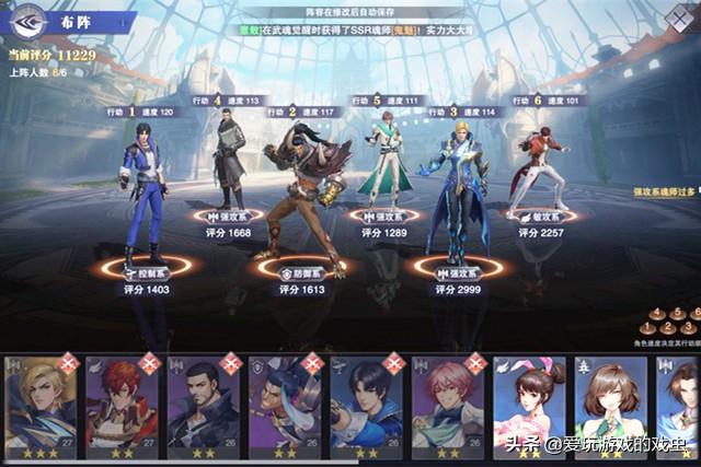 从boss的数量安排就能看出这一关比较适合单体输出型角色,当然游戏前期玩家可用的角色并没有这么全面,只能按照自己拥有的类型去配置。游戏推荐的阵容是两个强攻系魂师,敏攻系、控制系、辅助系和防御系魂师各一位,戏虫通关的阵容用的是新手角色唐三、大师,SSR玉天心、SR火无双、SR呼延力以及SR秦明,这些都是我抽卡的最佳成果。