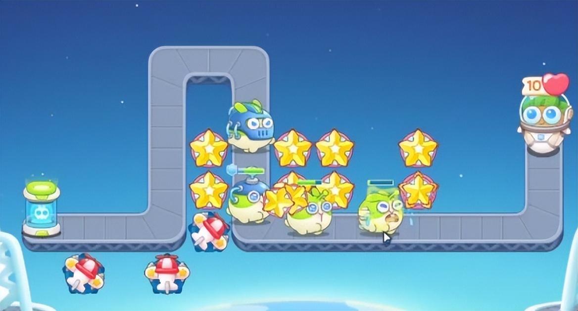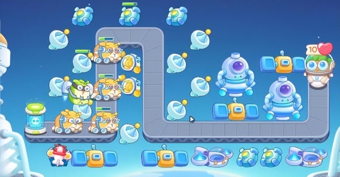 1、开局我们在洞口放上一个飞机然后在中间位置放上星星塔这样可以尽快的消除掉地图上的道具;