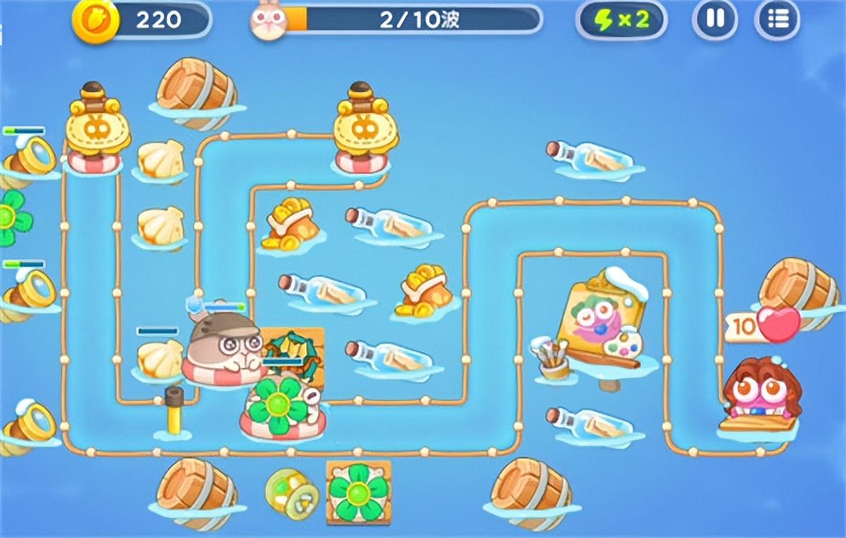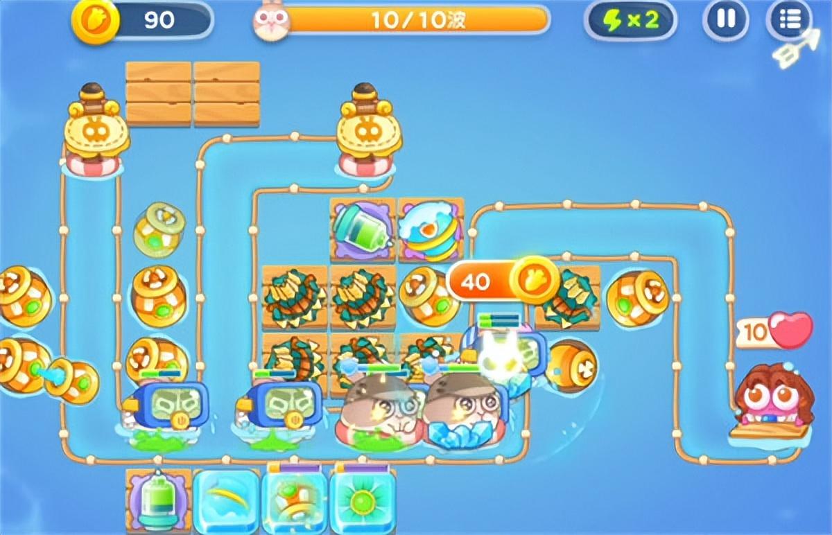 通关思路:使用鱼雷对付潜水兔,提前布置风扇清理建筑补足输出,后主要输出使用多重箭,布置雪球给滑板兔减速,控制冰冻兔死亡的位置。