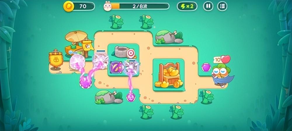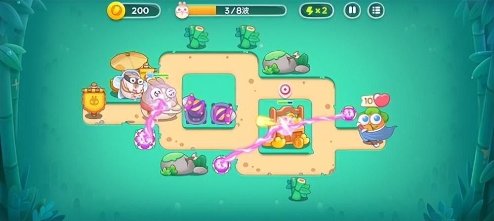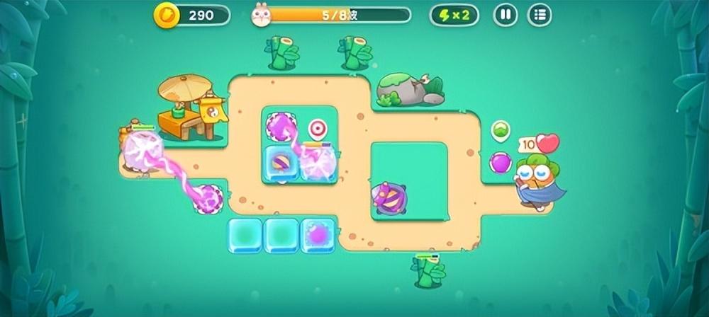3、用赚到的金币在竹子留下的空位放置一个导弹塔,然后再阿波的旁边设置一个魔法球用来阻拦怪物。