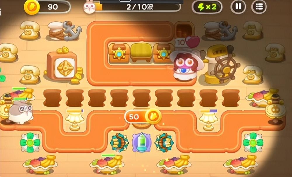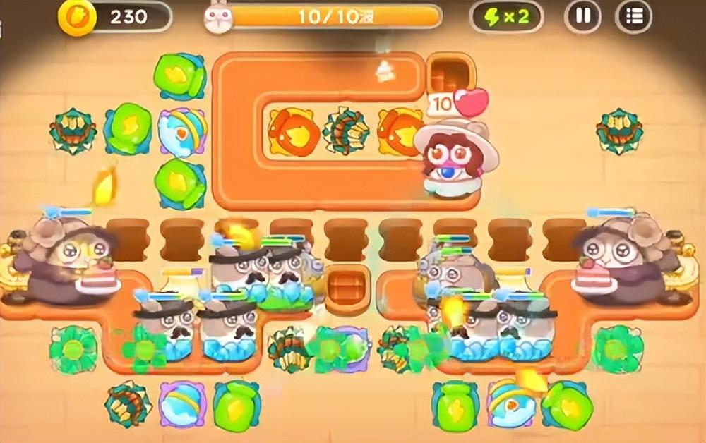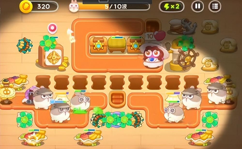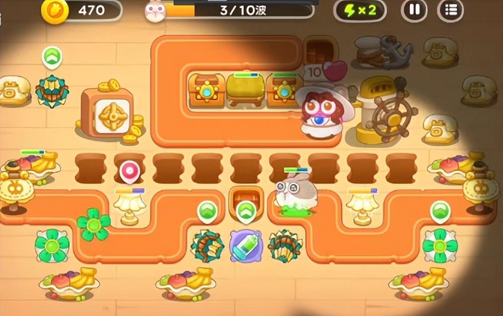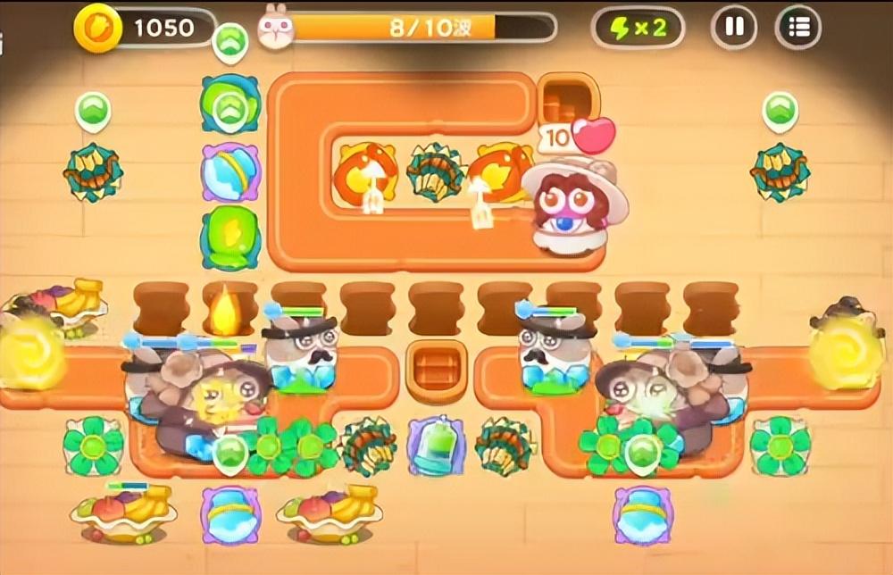 这里出兔子的数量多,种类也多,像贵妇兔、滑板兔都会密集出。应付的方式是一定要间隔建雪球,保证兔子一直在减速,剩下的就是建炮塔了,