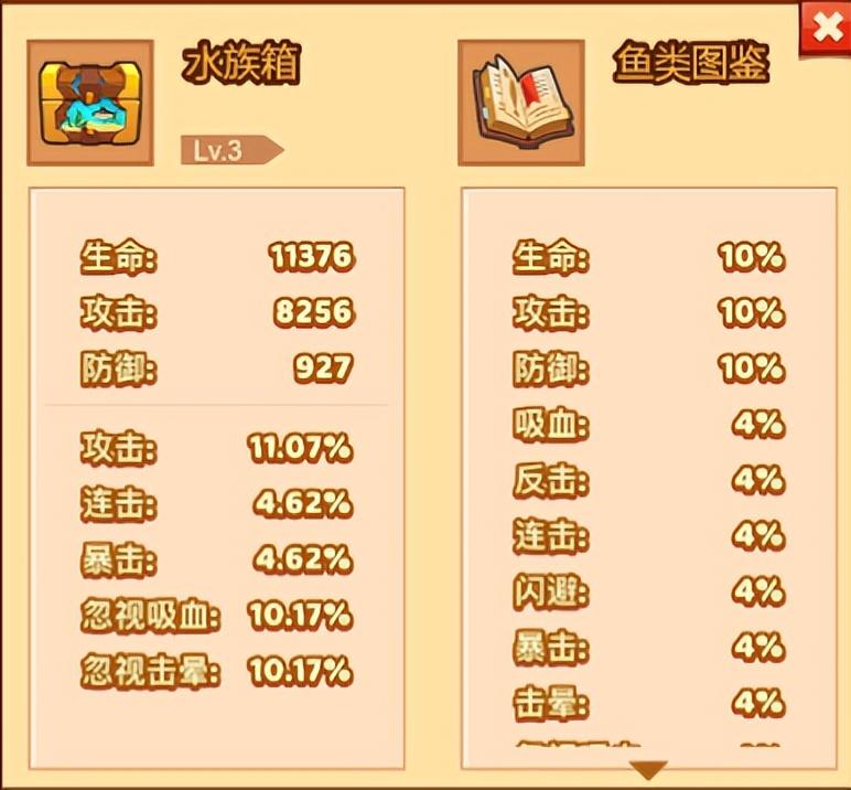 第二个组成就是我们的水族箱和鱼类图鉴,也就是你所捕获的鱼类存放的地方,各种种类不同的鱼类能够给予各项基础属性和特殊属性的提升也不同。其次的话就是咱们的一个图鉴了,图鉴也能对咱们的四项基础值有一个大的增幅。以及上面水族箱有一个增加近百分之十攻击力,也是一种增幅方式。这个应该是小编的虎鲨所提供的增幅。除了攻击之外还有防御值、生命值、速度等,生长长度越大的鱼所能够提供增幅值也就越大,所以小伙伴们在选择相同鱼类的时候,就选择长度最长的那一条。