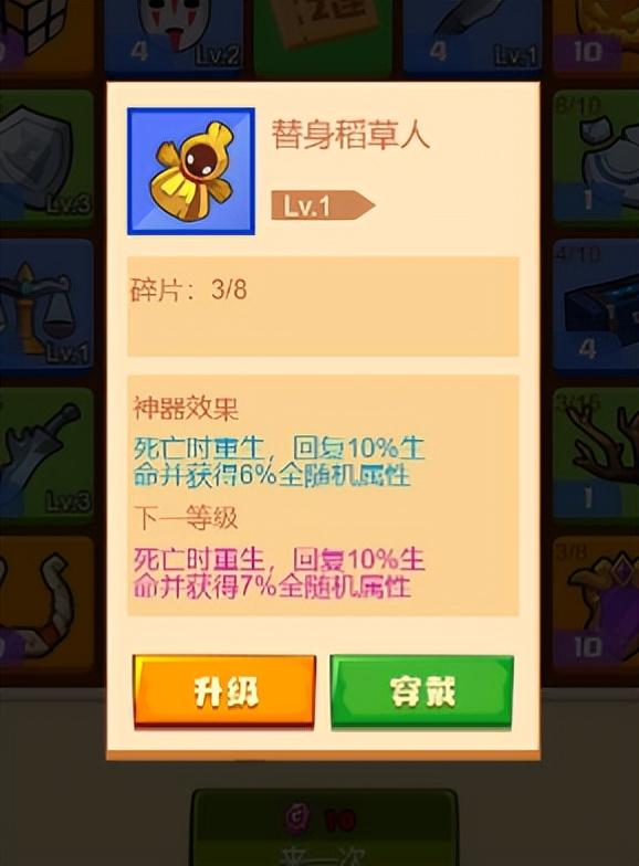 这个名为替身稻草人的神器,它的功效就是死亡重生,并且重生之后回复百分之十的血量并获得6%全随机属性加成,这件神器小伙伴们可以想一想认为觉得在哪个场景使用比较好呢?没错,那肯定就是在竞技场了,在竞技场两方实力相差不大的时候,装备这件神器就相当于最起码比对面多一回合或以上的伤害,因为复活后,肯定是你先攻击,若是再加上一些眩晕或者触发暴击的技能,那样会大几率反败为胜。