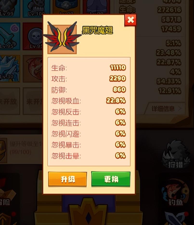 这个时候就应该拿出“黑咒魔翅”出来。其作用就是提高忽视吸血概率的。这样我们就很大程度上降低了对面最强属性的危害。所以这就是翅膀的灵活运用的地方,看到对手最高属性是什么就可以选择对应忽视的翅膀来抵消伤害。