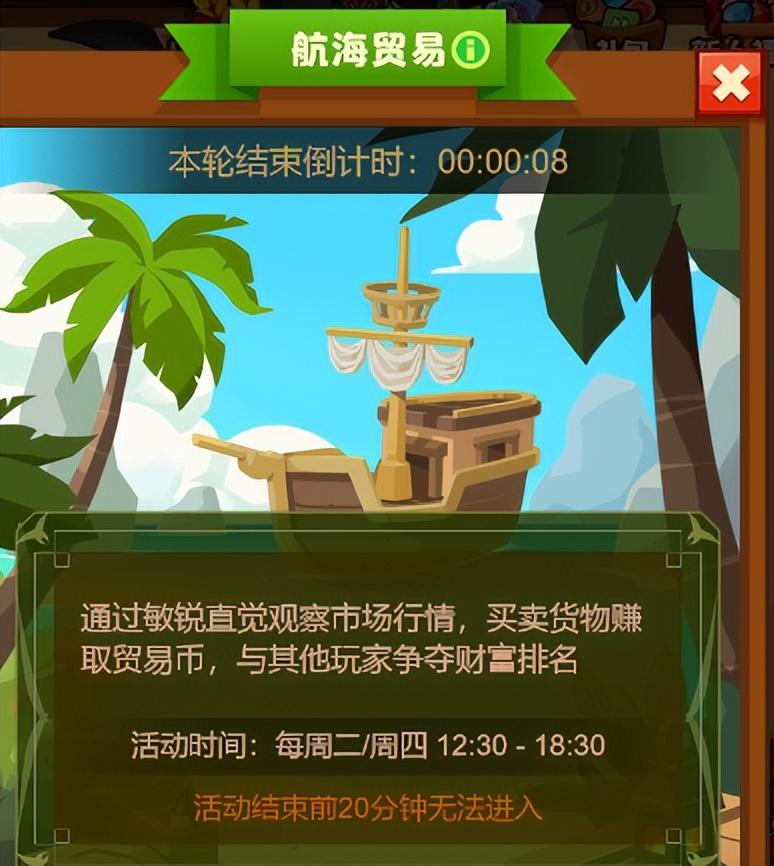 小编首先给还不知道的小伙伴们再一次重新介绍一下咱们航海贸易活动的游戏规则。这一个活动的开放时间是每周二和每周四的中午十二点开始,一直到下午的六点才结束。并且每次活动有三次进入的机会,初始金额为一万交易币,并且每一次只有20分钟。单次结束时按所余金额排名,这里有两个小知识点要补充,那就是贸易商店每周更新一次上架货品;还有就是活动结束前二十分钟不可进入。