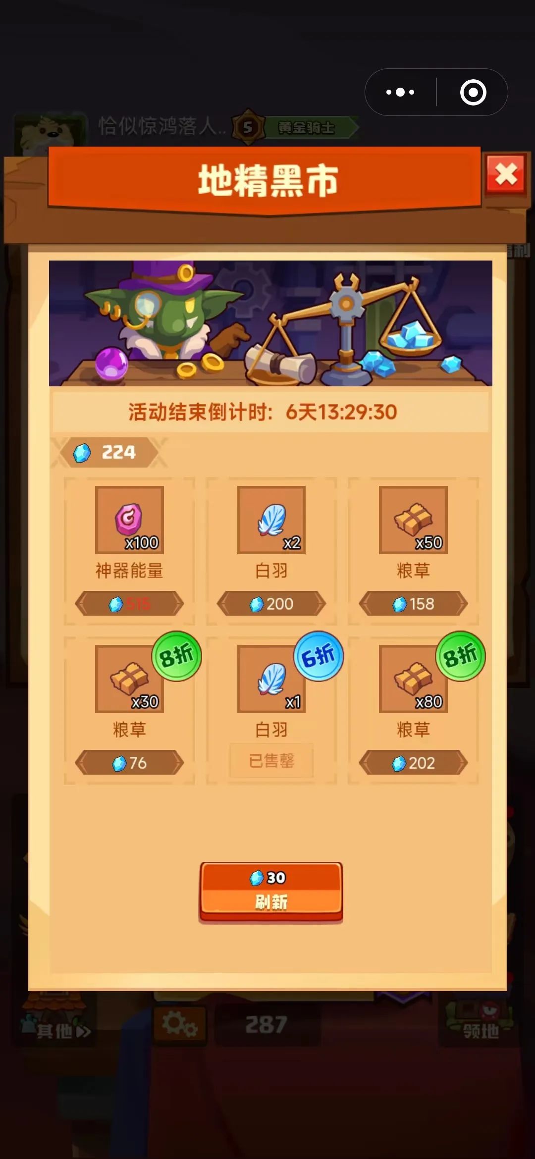 最后给大家补充一个今天新出的活动--地精黑市。里面拥有许多大家平常所需要的物资,比如抽取神器的神器能量、升级翅膀等级的白羽、提升坐骑等级的粮草等。首次刷新物资是免费的噢,小伙伴们可以根据自己的需求进行购买。对于小编的感受来说就是这些个物资有点高价。不过小编建议大家在比较急需的时候再进行购买。毕竟这些物资咱们经过时间的推磨都是可以免费获得的。当然这仅限于时间比较充裕的小伙伴。