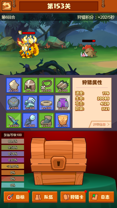 还是回到咱们这个初始的界面,小编刚闯到第一百五十三关。其实狩猎本质上就是将外面的闯关缩影到了这里。而且每次的狩猎都是会重新刷新的。
