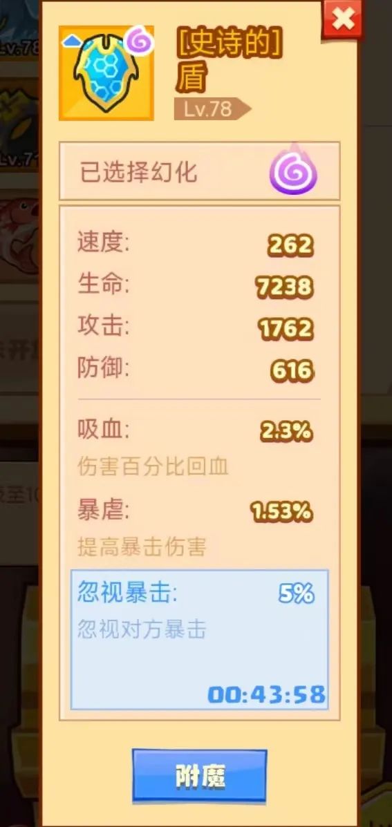 咱们再来看一下这个史诗级的防御装。它的附魔效果就是增加百分之五的忽视暴击的效果。小伙伴们在进行闯关时应该经常遇到,每次boss只剩下一击血量的时候忽然就被一个暴击斩杀了。当咱们将这件装备附魔好了之后就不会发生这样的事情了嘛?当然不是,小编之前说过这是一个概率性的游戏。虽然只有小小的百分之五。但是当我们闯关的数量叠加起来的时候,获取胜利的几率是不是就更高一些了呢。