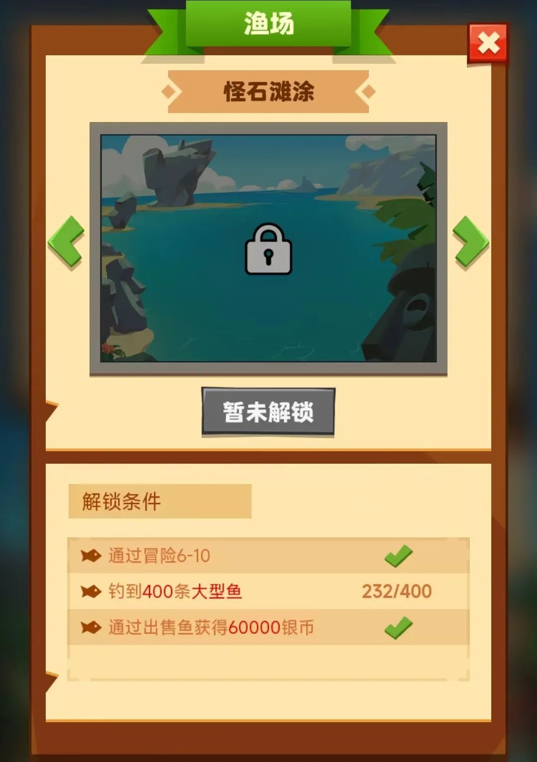 首先就看一下咱们的渔场开启条件,首先得通关6-10关卡。这个基本上难度不大。大家都能很轻易得完成。然后就是钓鱼要求,需要钓上400大型鱼类。大多数应该都是卡在这个地方。然后就是通过出售鱼类获得60000银币,这个只要将第二条完成了基本上也是能够完成的。所以咱们今天主要就是来讲一讲如何快速的钓上更多的大型鱼。