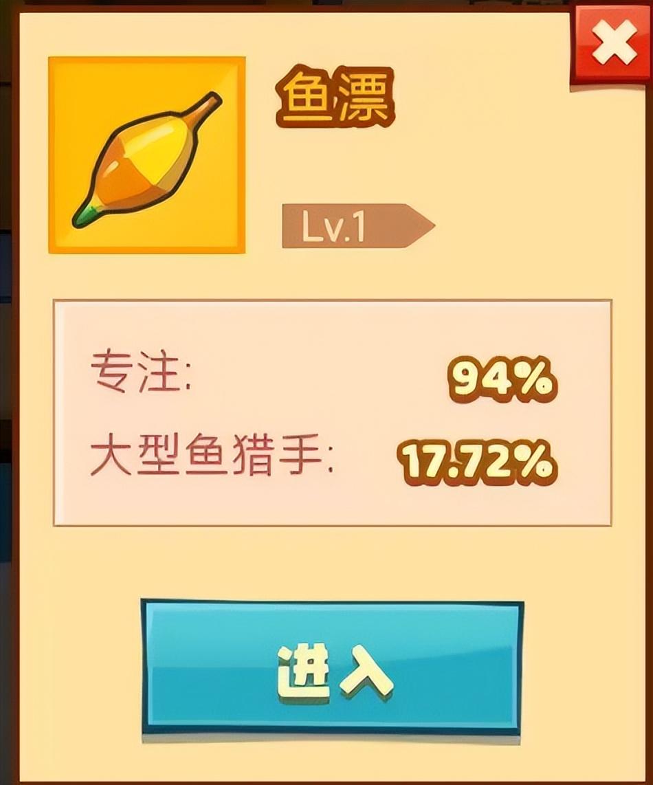 然后小编再一一给大家展示一下各个渔具的等级以及各增加属性。鱼漂小编已经升级到金色品质。并且也是洗炼出大型鱼猎手增加属性。