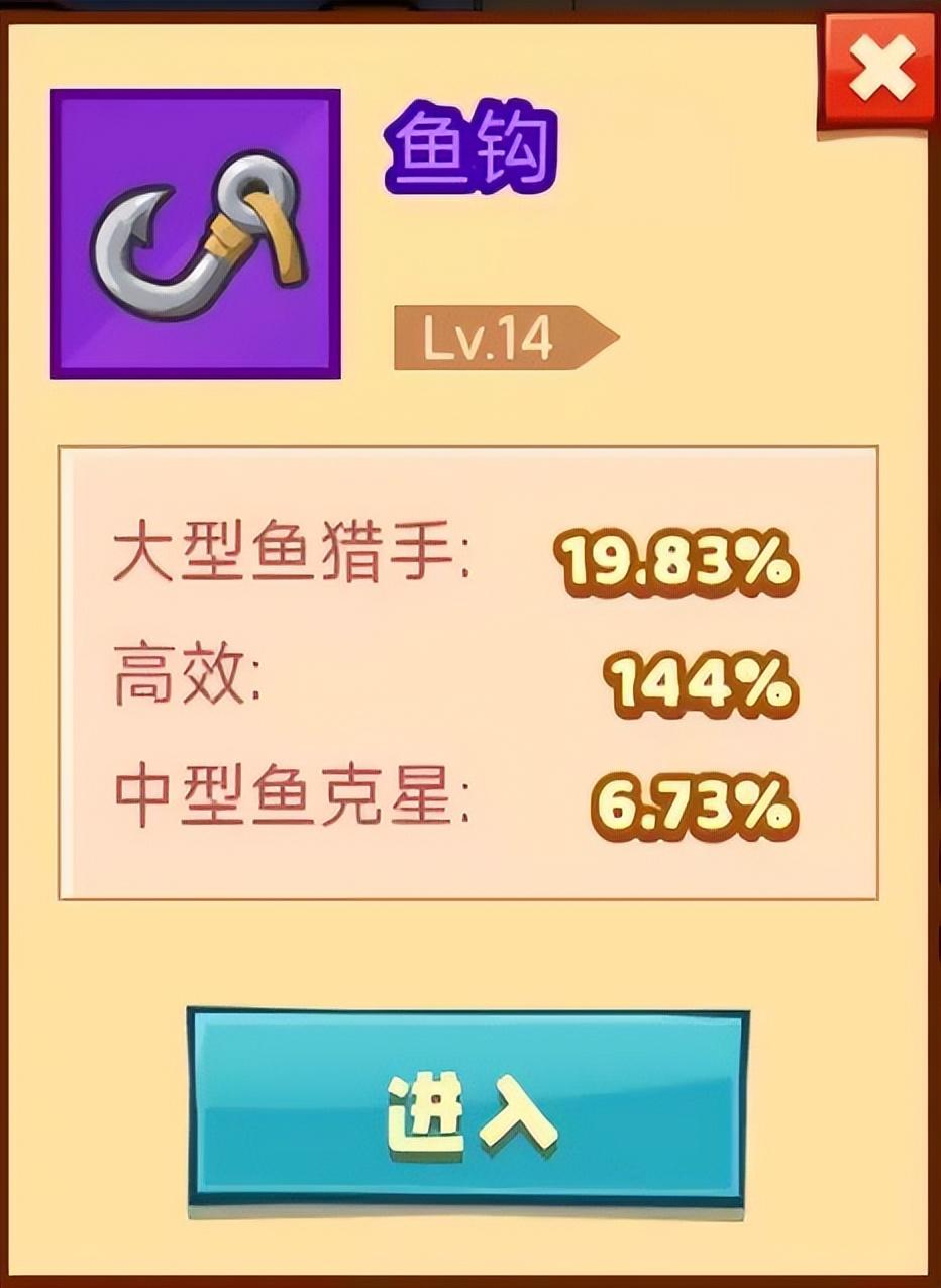以及咱们的一个鱼钩,不过鱼钩等级虽然提升稍微慢了一点。但也快到金色品质了。这里小编运气比较好。同时洗炼出两个大型鱼猎手属性。洗炼这些渔具小编一共花了差不多五百颗钻石。当然如果运气好肯定能够更快的刷到这些属性。