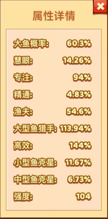最后给大家看一下小编的属性情况。通过红虾拟饵的叠加。小编的大型鱼猎手属性已经增加到了百分之一百一十多。实话讲小编都没看懂这个属性了,这难道意味着每一钓都是大型鱼了嘛?所以小编还是准备实践一下。