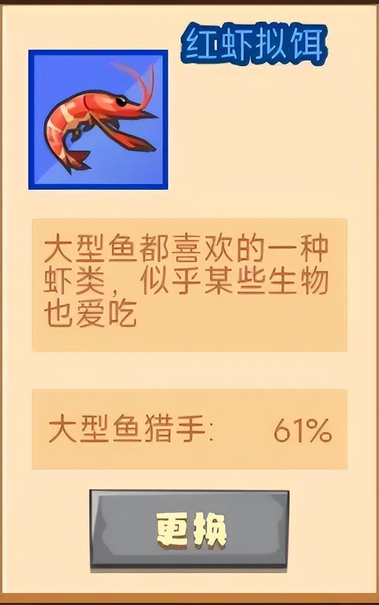 接下来就该重点介绍一下咱们的鱼饵了。毕竟它才是重头戏--红虾拟饵。咱们钓大型鱼可少不了它的帮衬。在商店中就可以购买。二十颗钻石能够获得十只红虾拟饵。最近的渔获活动中也可以获得它。它的功效就是增加百分之六十一的大型鱼猎手属性。能够极大的提高咱们钓上大型鱼类的几率。