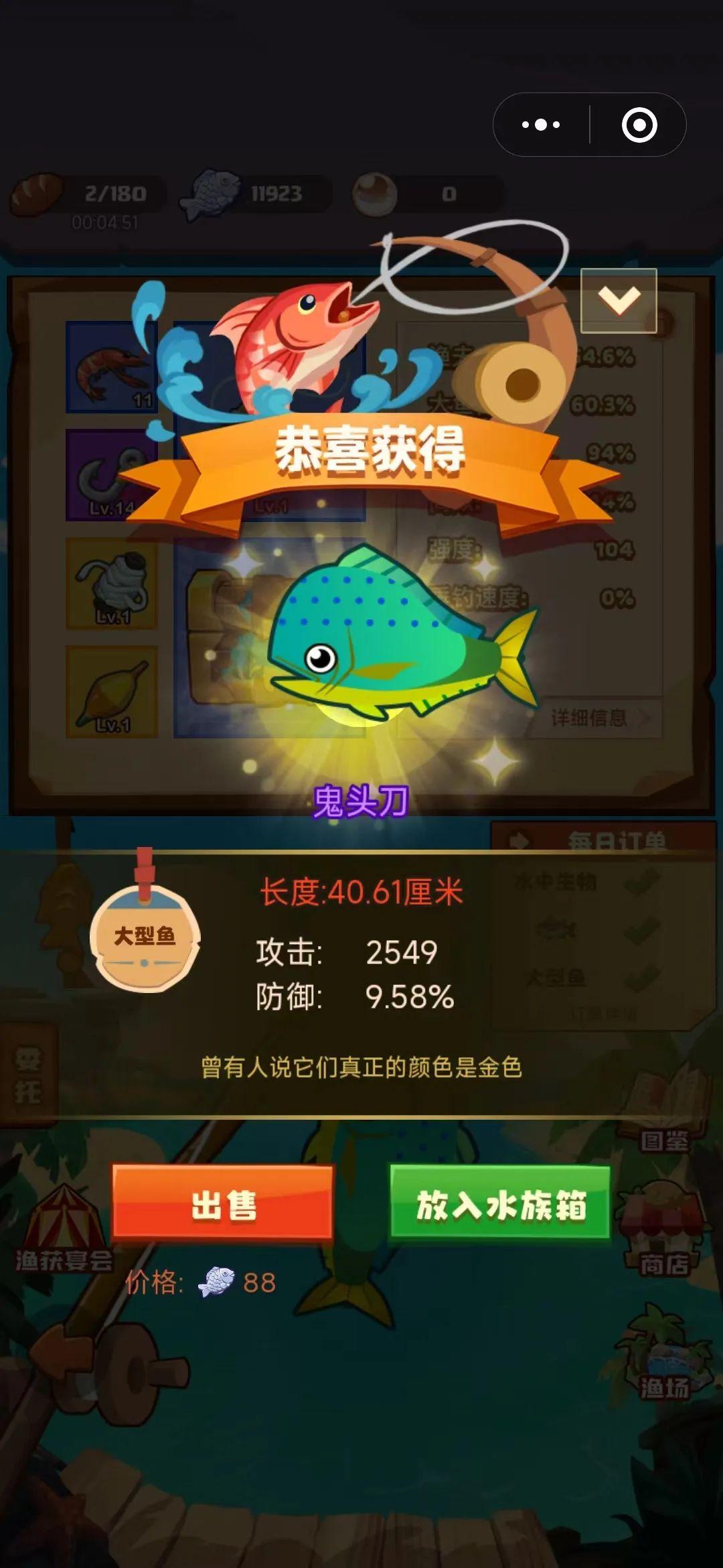 实话讲,小编高估了这个属性值。小编试了一下,差不多十钓进四左右。这属实有点诧异了。本以为起码能上五上六。结果连一半都没到。属实有点捉瞎这么好看的属性值了。然后找了一下问题所在。大概率出现在了钓竿上。因为一开始为了降低鱼的逃跑率。小编使劲提升鱼线和鱼漂。所以现在鱼竿还只是在蓝色品质。回头把钓竿提升上来看能不能有更好的一个收获。