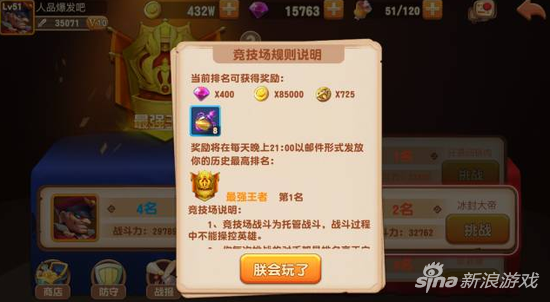 最后说一点就是游戏里的每日日常任务,坚持每天每个任务都做完,一来保障等级的提升,二来0元党可以用获得的活跃币来换取VIP等级,高V可以用活跃币买蓝箱,把非主力英雄全部装备蓝+1,最大限度的提升气势,提升战力。