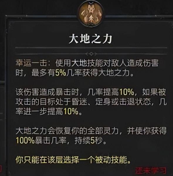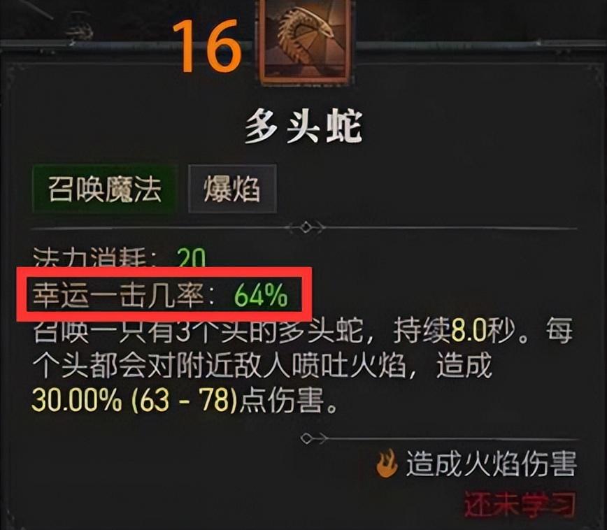 最后就是较为复杂的“幸运一击”。其实它理解起来也很简单,就是二代的“击中怪物有XX几率触发XX技能”的变种版。首先,在每个主动技能下面都有初始的幸运一击几率,也就是施法这个技能会触发幸运一击的概率。