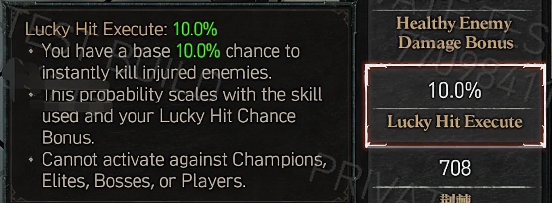 在没有其他技能和装备的加持下,普通的幸运一击是斩杀效果。也就是进行第二步判定,如果刚好是这10%,则能秒杀低生命值的小怪。