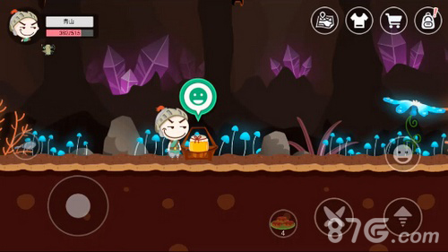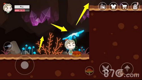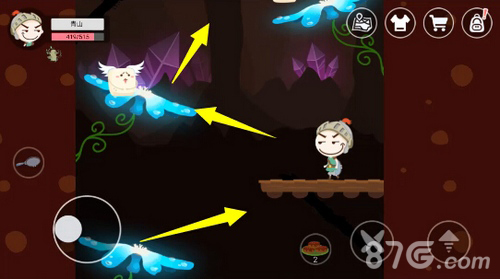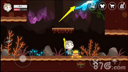 进入青瓜回廊关卡1,向左走到高台阶,借助蓝色花可以弹跳到达左边高台阶上。