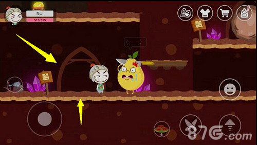 向左走进入水晶通道,一直向左走直到遇到头上插刀的柚子,头上插刀的柚子旁边的洞口就是青瓜回廊的入口。