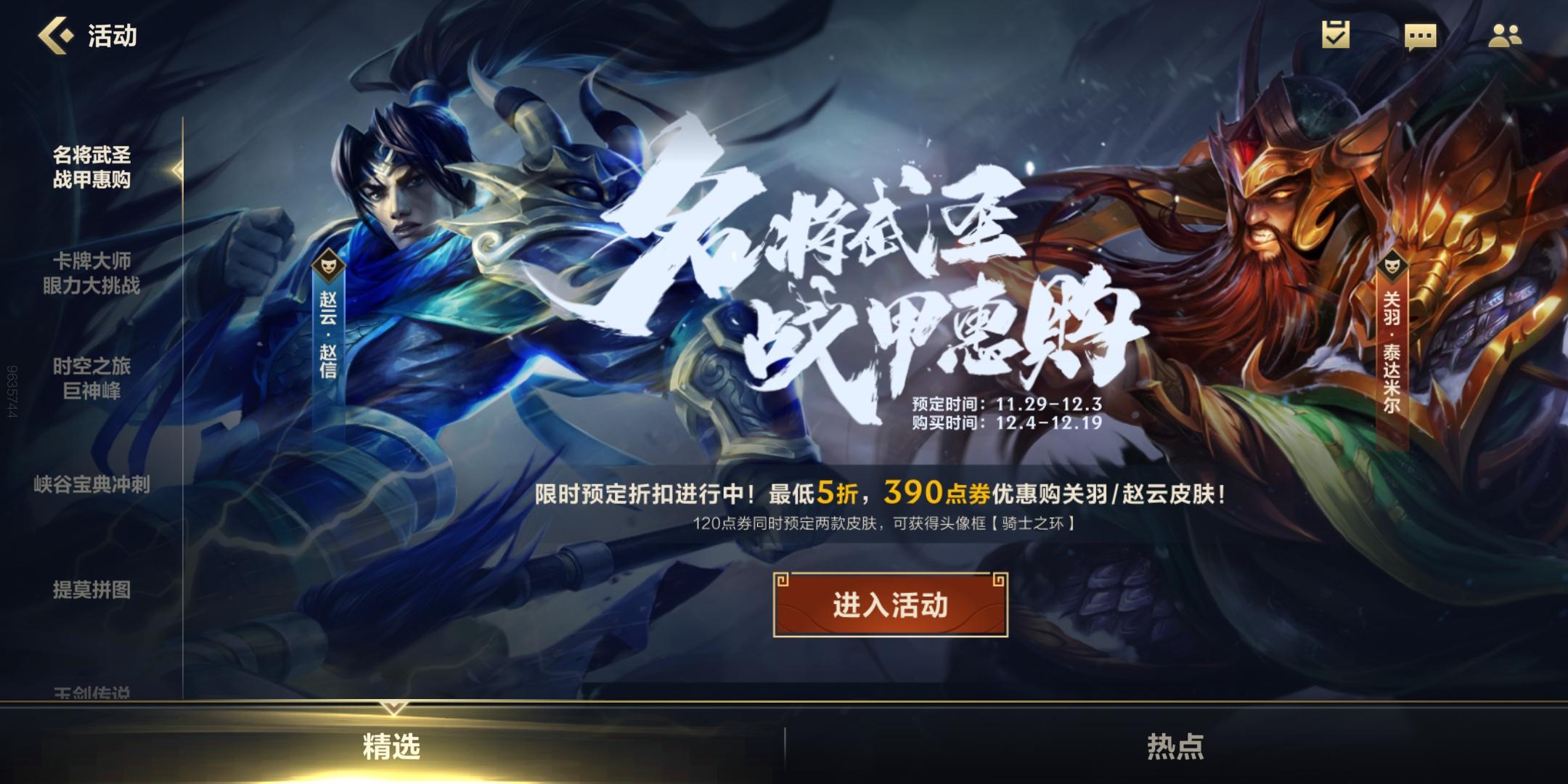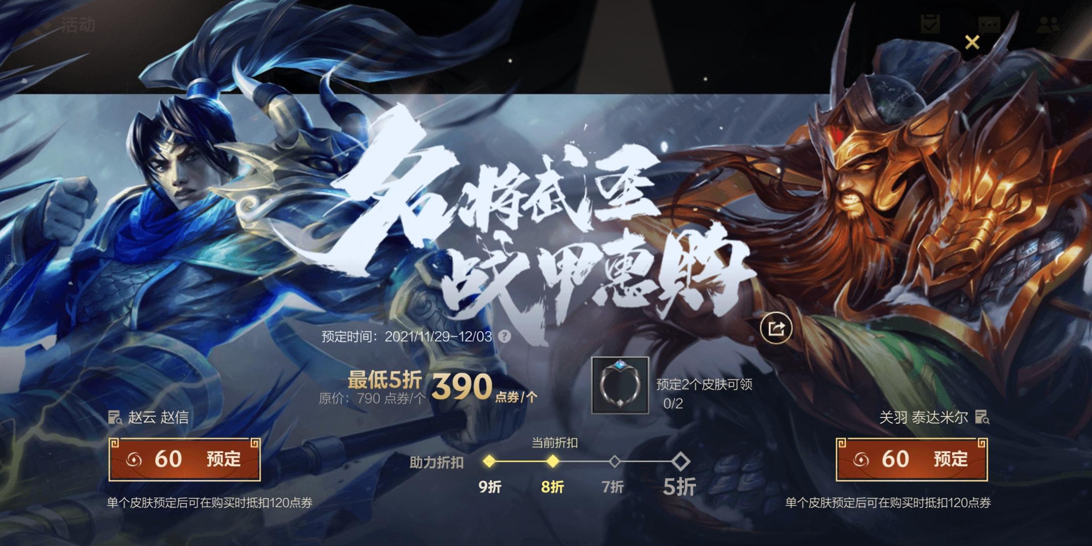 三国皮肤活动今天上线了,正式开售时间是12月4号,共有两款皮肤,分别是赵云-赵信和关羽-泰达米尔。