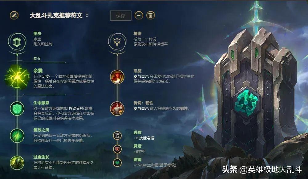 符文解析:扎克作为开团英雄必带余震,能抗得更久,确保打完RQ的控制。