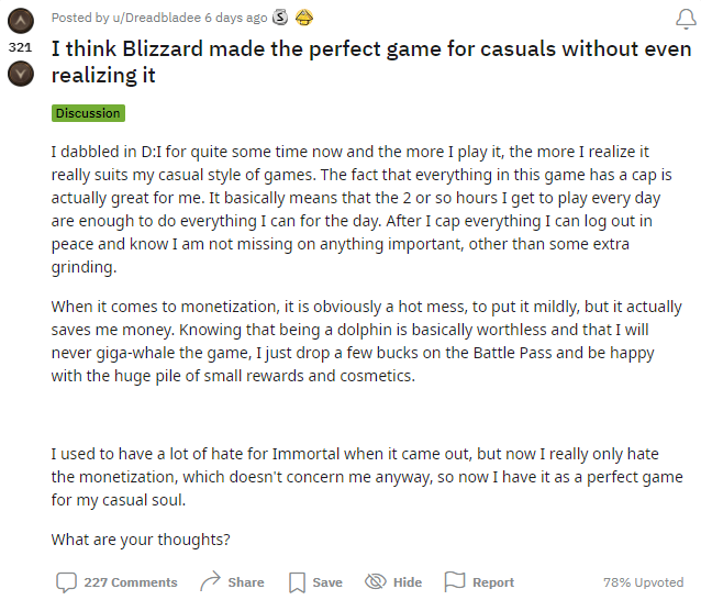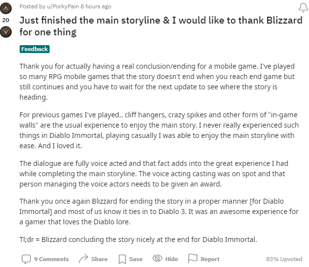 翻阅reddit专区的时候,我看到这样一个帖子,楼主称赞了游戏的剧情内容,《暗黑破坏神:不朽》的主线讲了一个完整的故事,这让他很受用。