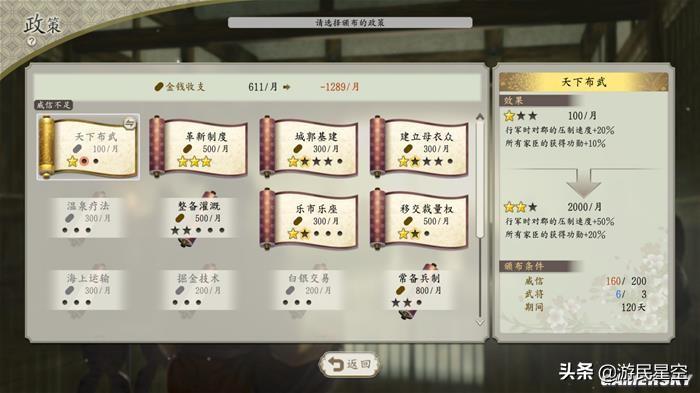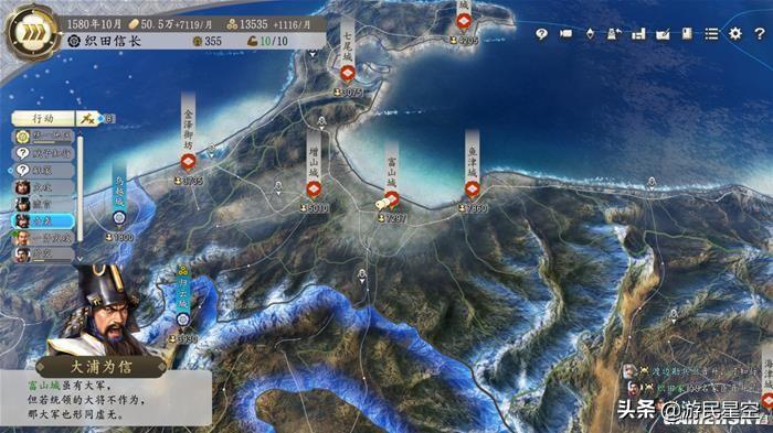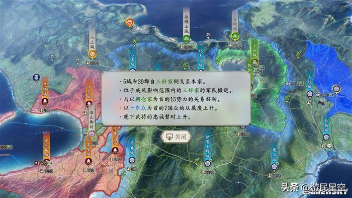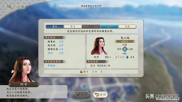 这些AI武将们不仅能耍嘴皮子出主意,还可以当封臣上山下乡干实事。每座城的领地内都有许多个郡,你不仅能分封城主,还可以分封管理郡的“知行”或“代官”。他们会自动徵兵、自动开发,还会按照玩家定下的方针自动修建设施。这种放权给封臣开发建设的体验,给人带来了一些近似《十字军之王》的感觉。