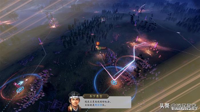 本作中的会战,不再是前两作中那样对《全面战争》的拙劣模仿,而是一次大胆而又优秀的创新。在会战中,武将们会依靠自己的特性以及AI等级,来自主决定下一步的行动。而一些谋士类型的武将,还会积极给予玩家各类建议,例如该在何时乘虚而入,何时夹击敌军,这让会战实际上变成了“半自动”。不过,这些建议会让玩家的镜头产生移动,在三速下镜头切换十分频繁,也无法选择关闭,以至于会影响到会战中的节奏。