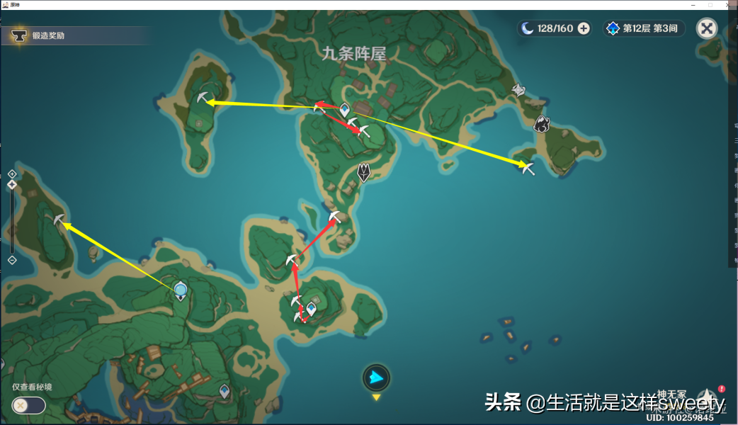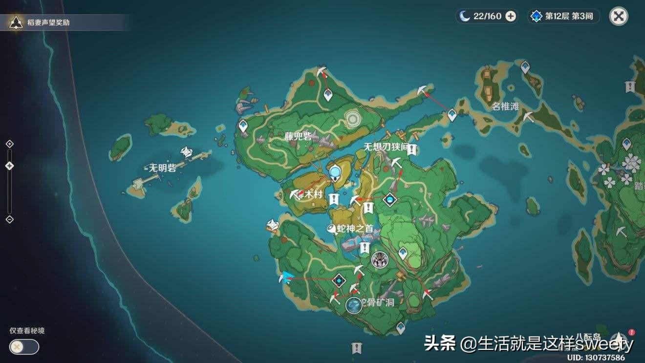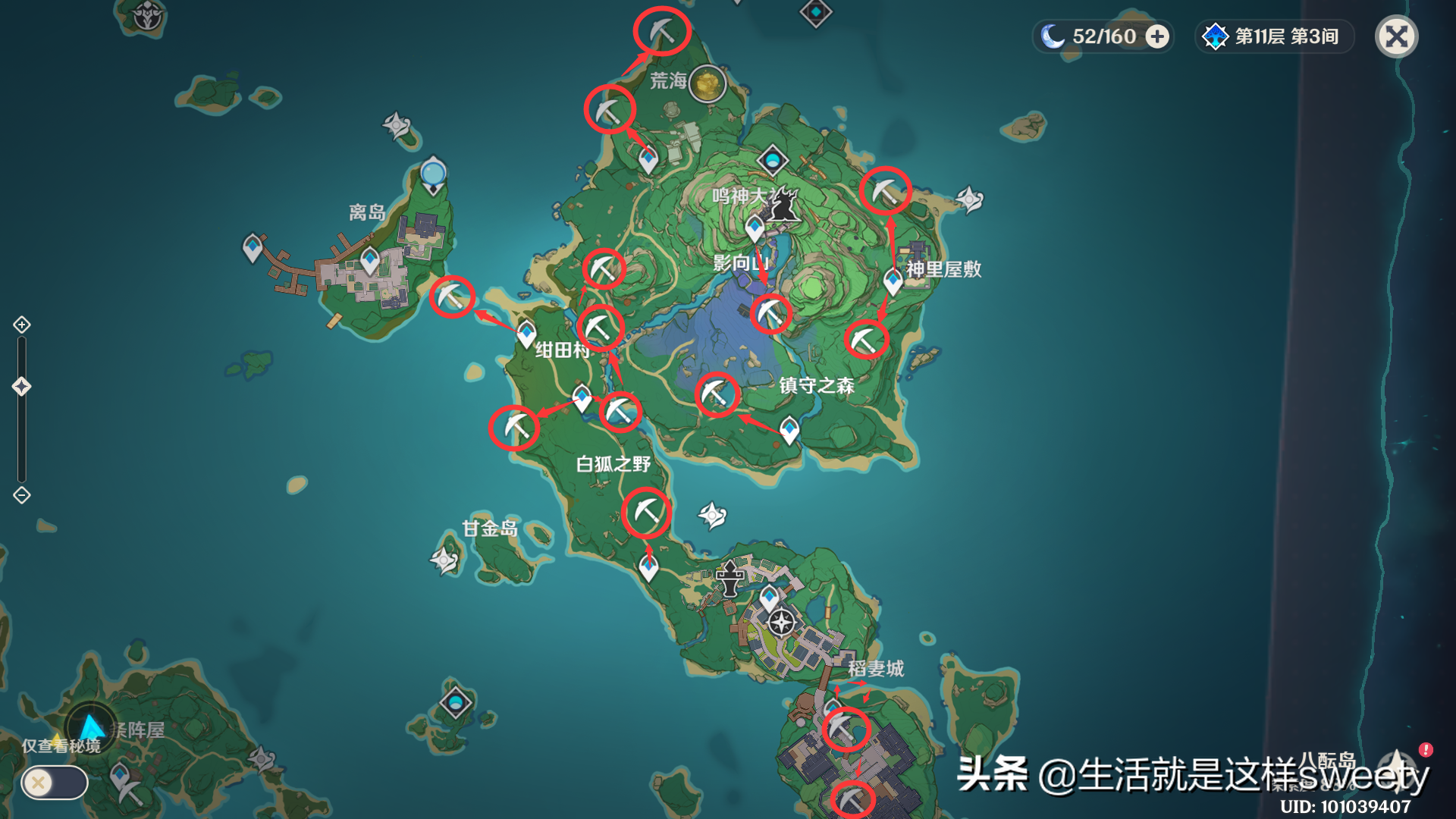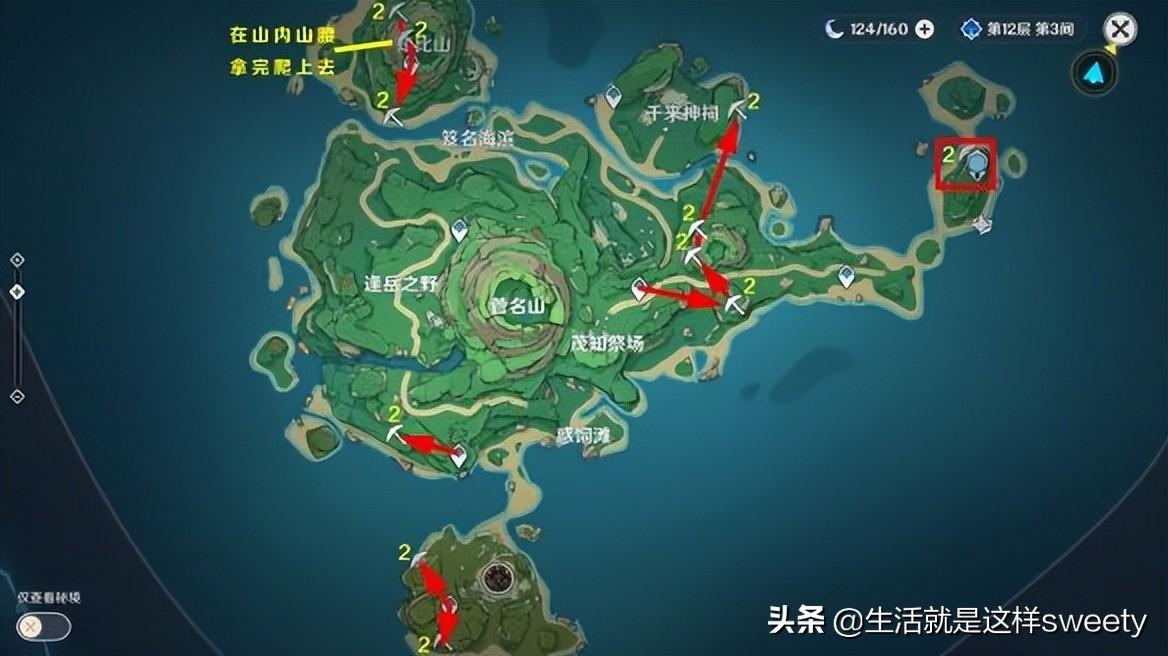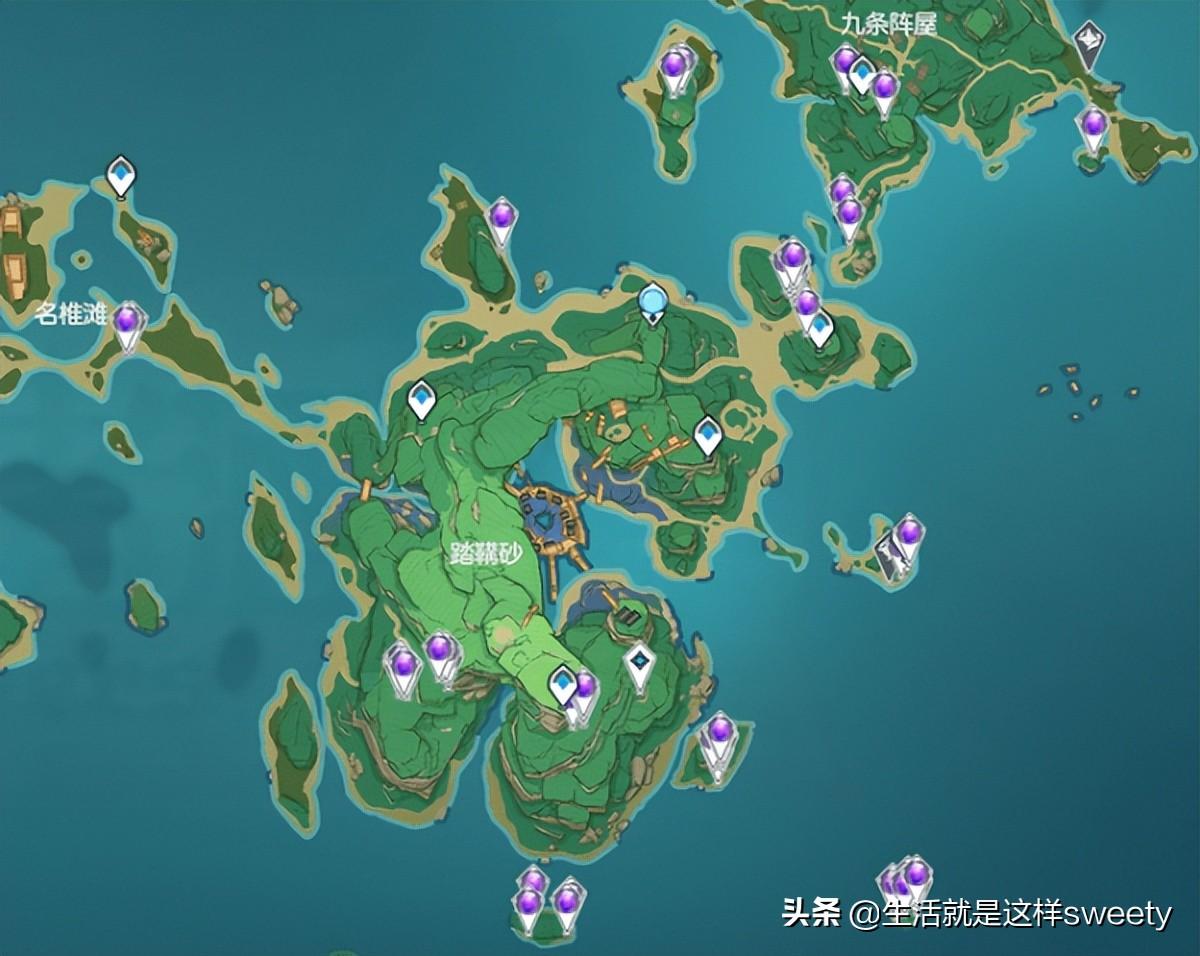稻妻城这个路线,个人并不是很建议去,因为紫晶块的数量不多,且比较花费时间。