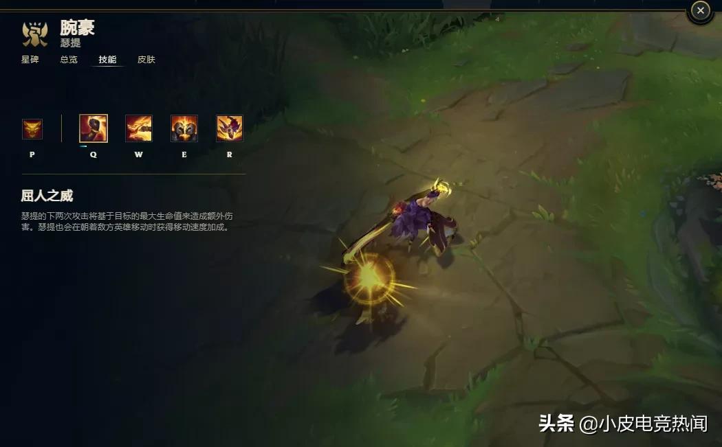 瑟提的下两次攻击,将基于目标的最大生命值来造成额外伤害。瑟提也会在朝着敌方英雄移动时获得移速加成。(这技能没啥可说的)