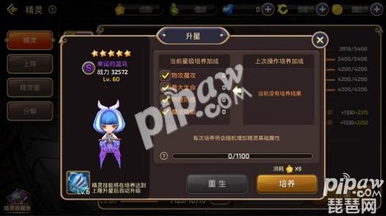 **升星:就是利用所谓的升星药水,提升精灵的质量的(包括技能+属性+资质)。除此之外,还有一点是值得注意的:就是重生重新培养该精灵,重生是不会消耗药水的。