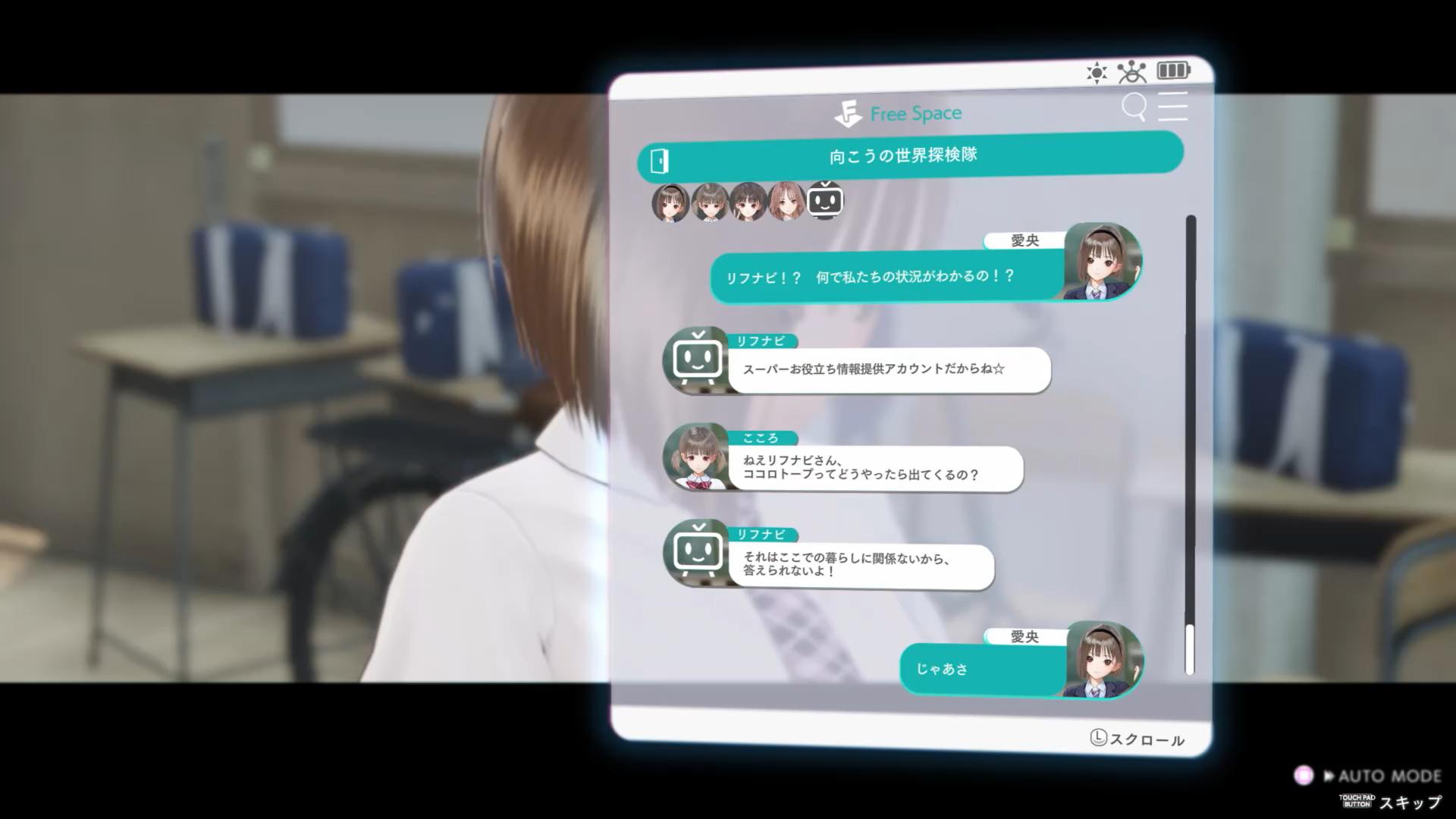 某一天突然被传送到异世界的星崎爱央,在这里的学校中与另外三名失去过去记忆的女高中生相遇并开启了集体生活。玩家不仅无从得知她们三人生活在学校的原因,就连食材收集的过程也都充满了各种谜团。虽然神秘的 BOT「利芙导航」会在「自由空间」(可以理解为异世界里的微信)中给予玩家建议,不过由于这个世界实在是谜团过多,就连利芙导航的建议看上去都有些可疑。本作会在不同章节中展现出截然不同的氛围,既有欢快的日常和百合情节,也有充满不安感的恐怖展开。