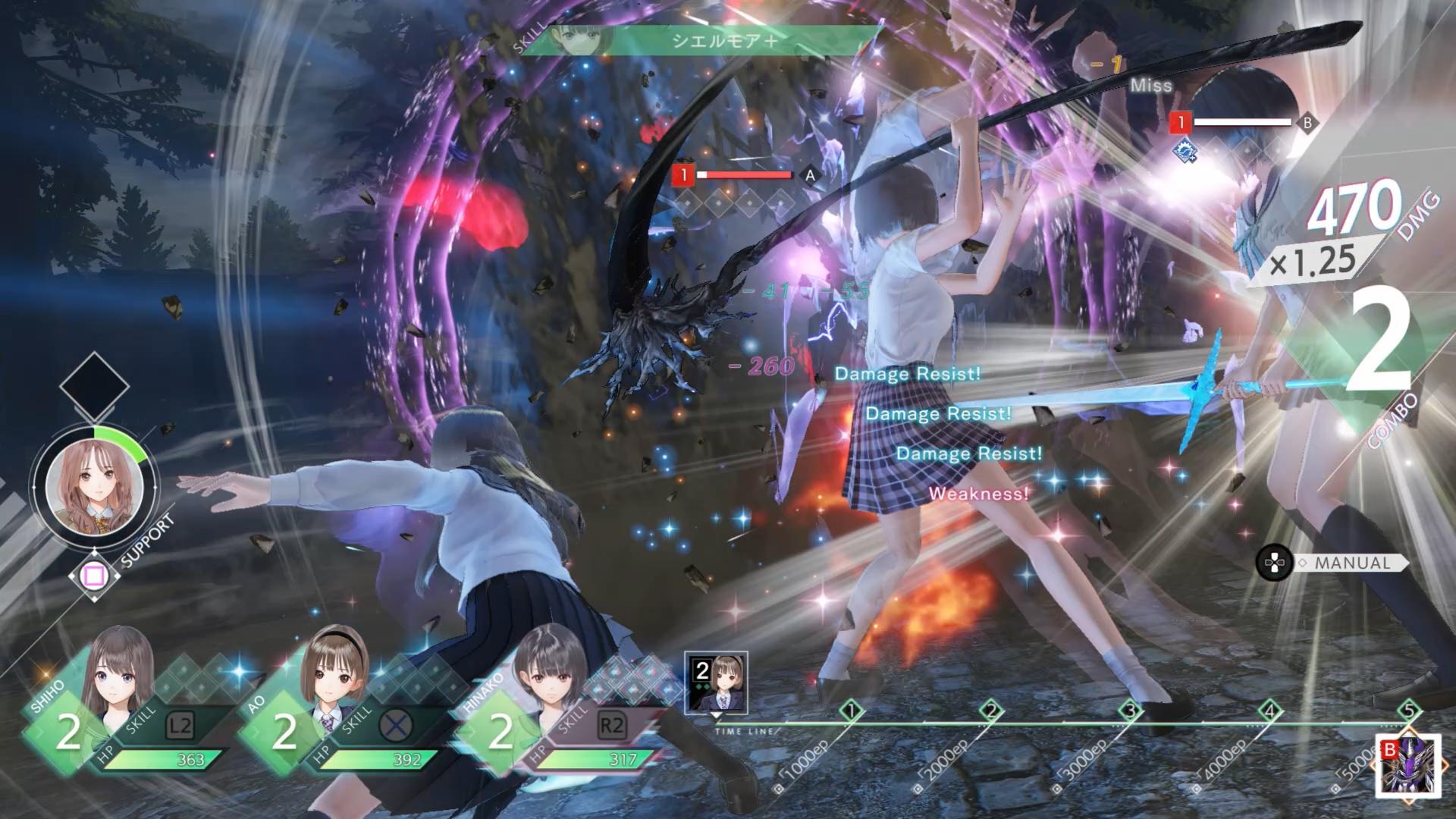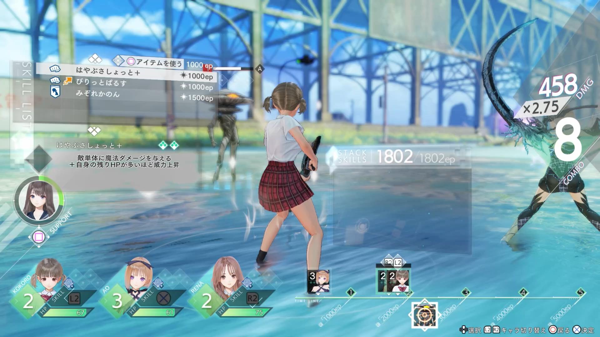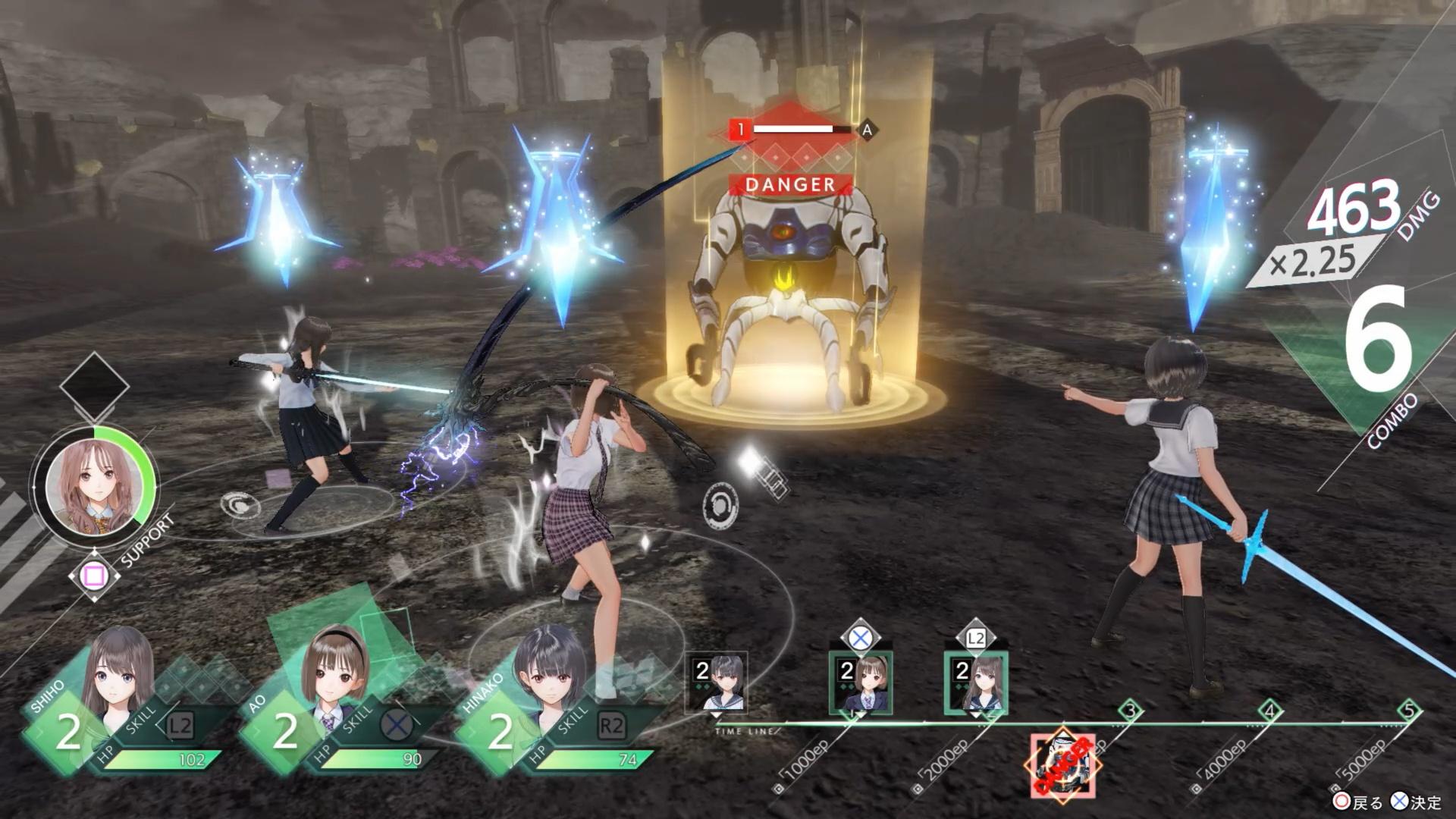 尽管战斗系统的底子很扎实,但实际体验上仍有许多不尽如人意的地方。首先是缺乏防御和增益之类的系统,导致战斗的策略性差点意思。并且在说策略性之前,光是连击加成效果就已经强大到破坏战斗平衡性的地步了。笔者在游戏中常常会遇到这种哭笑不得的情况:当战况随着笔者防下敌人的猛攻而趋于平稳之时,上一秒刚想进行反击,下一秒少女们就用猛烈的连击加成瞬间粉碎了敌人。即便是通关后解锁的困难模式里,游戏的连击加成依然高得吓人。另一点令人遗憾的是,包含主人公在内,游戏中只有两名角色可以使用防御 DANGER 攻击并阻止连击数中断的技能,这在某种程度上也剥夺了玩家编组队伍的自由度。
