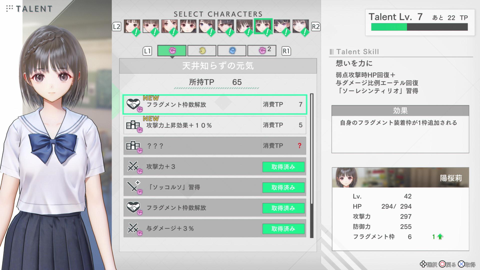 虽说练级也能提升角色的基础能力,但如果要让少女们真正变强,还是必须与她们搞好关系,也就是通过任务和约会获取 TP(天赋点数)。当 TP 总量达到一定数值时,少女的天赋等级便会上升,她能学会的技能和获得的加成也会随之增加。由于最终一定能学会所有技能,所以在感觉上更接近于收集要素。
