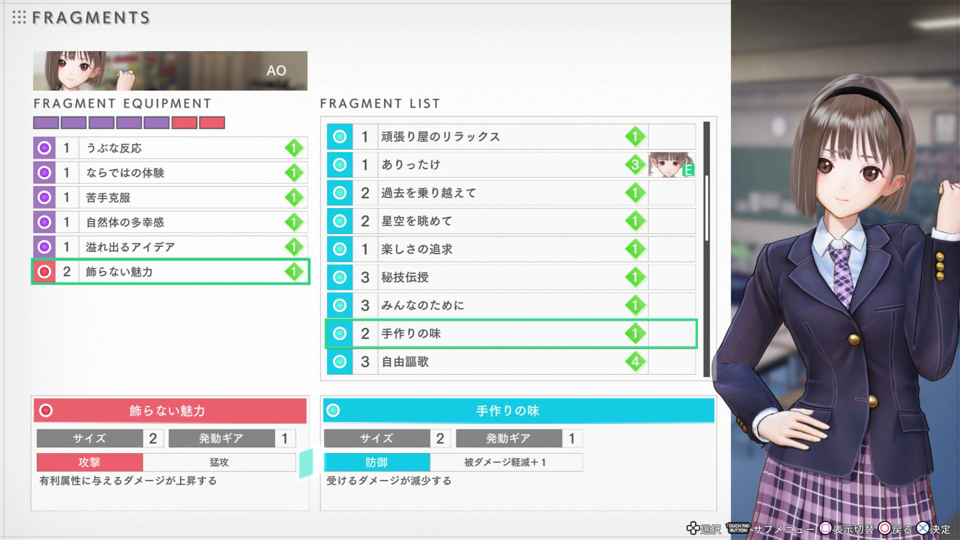 约会不仅能获取 TP ,而且可以获得本作唯一的装备要素「意念碎片」。意念碎片的装备效果五花八门,从提升角色状态到提升回复技能效果应有尽有。由于意念碎片的装备数量有限,因此这可以说是本作养成系统中最需要反复试错的要素。