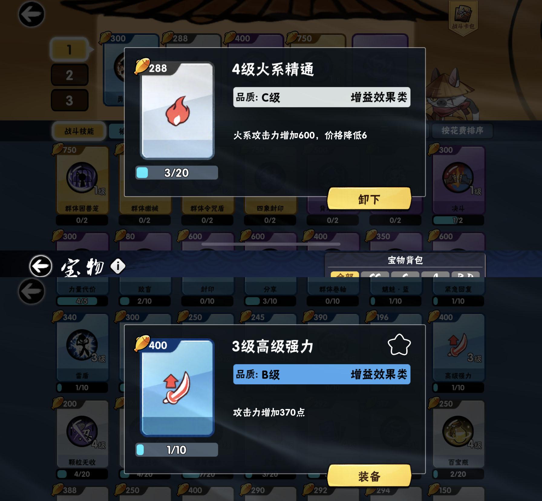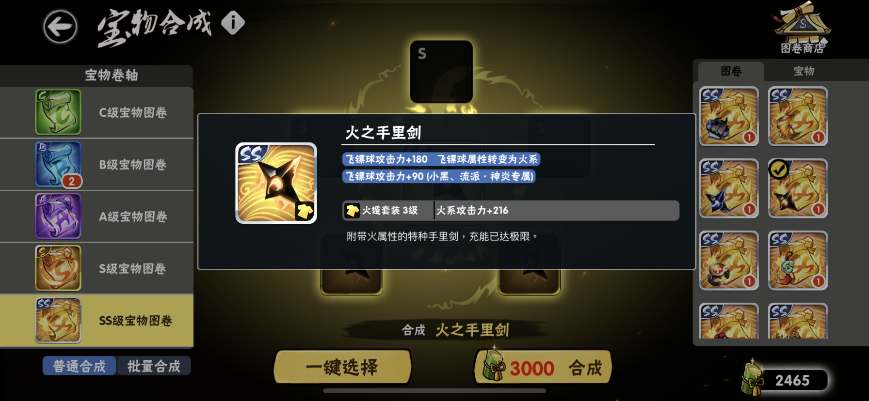 很多宝物升到3钩很强,做为平民玩家。要做3钩是需要很长时间的。我推荐最先制作属性套装。属性套虽然不能升钩,但它本身加的属性就很高,而且飞镖属性还能变得和你忍术。那是个什么概念呢。你其他宝物或购买的只加属性攻击的东西,飞镖也有收益了。和直接加攻击力一样了。使用的场景也非常多。