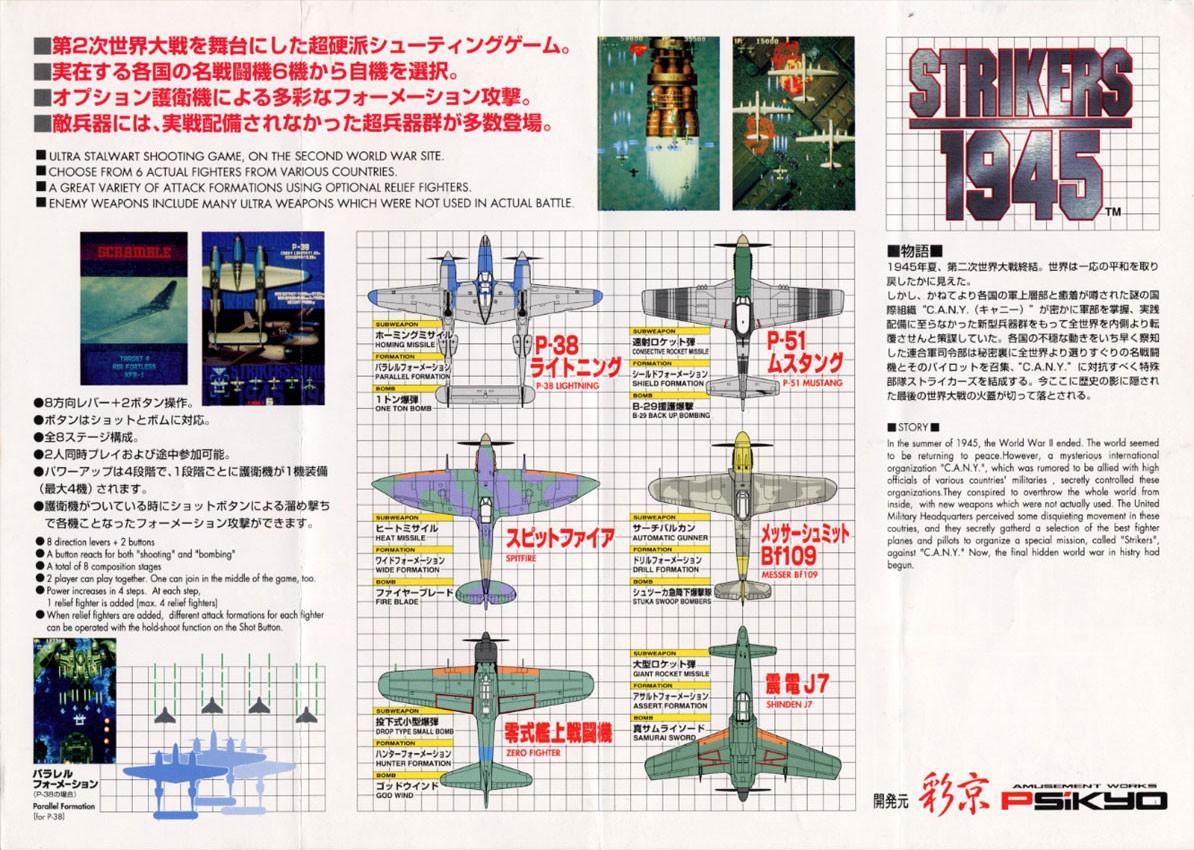 1995年,彩京推出了革命性作品街机版《打击者1945》(Strikers 1945),游戏的故事背景设定在二战刚刚结束的1945年,人类刚刚庆祝和平没多久,便出现了新的邪恶军事组织CANY,还带来了大量火箭、飞碟、机器人等黑科技武器,一些刚刚经历战争的顶级飞行员,驾驶着六架二战经典战机,组成了名为“打击者”小组,踏上了粉碎CANY阴谋的征程。