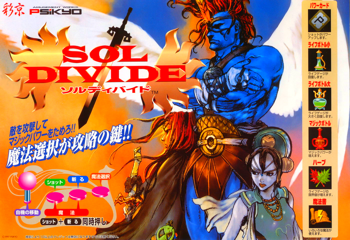 1997年,彩京在街机上推出了非常有特色的新作《太阳表决》(Sol Divide),本作采用了横版卷轴形式,玩家操作的主角在空中飞行时,除了传统的发射子弹攻击外,还可以使用威力强大的近身攻击,连按后还有最多四段连续技,连续技成功后可以让敌人暂时定住,在对付BOSS时非常有用。游戏取消了保险设定,改为可选择使用的魔法,魔法有属性设定,针对特定敌人释放弱点属性魔法,能起到事半功倍的效果。